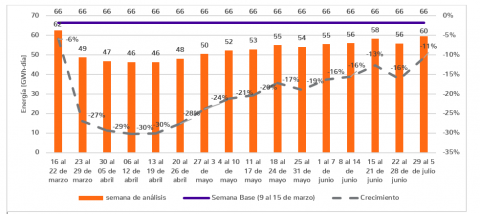 La demanda de energía se viene recuperando gradualmente al pasar de un decrecimiento promedio en los días hábiles de -28.1% en el periodo del 20 de marzo al 26 de abril respecto de la semana base, a un decrecimiento de -15.0% desde el 27 de abril al 3 de julio